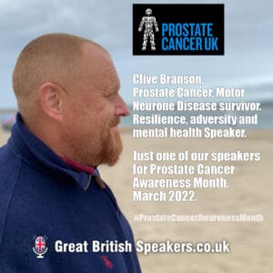 Clive Branson’s own diagnosis of prostate cancer makes him one of our most motivational speakers on the topic. In 2017, Clive was diagnosed with Motor Neurone Disease and subsequently lost his career, income, confidence and was starting to lose his identity. But more recently, Clive was given the devastating diagnosis of stage two prostate cancer. Unfortunately, his Motor Neurone disease means that doctors cannot operate. Today, Clive’s mission now is to actively demonstrate that we do have the ability to overcome adversity. Resilience, Hope and Positivity are crucial words in his vocabulary. He is a truly inspirational speaker who can connect emotionally with any audience also struggling with a diagnosis.